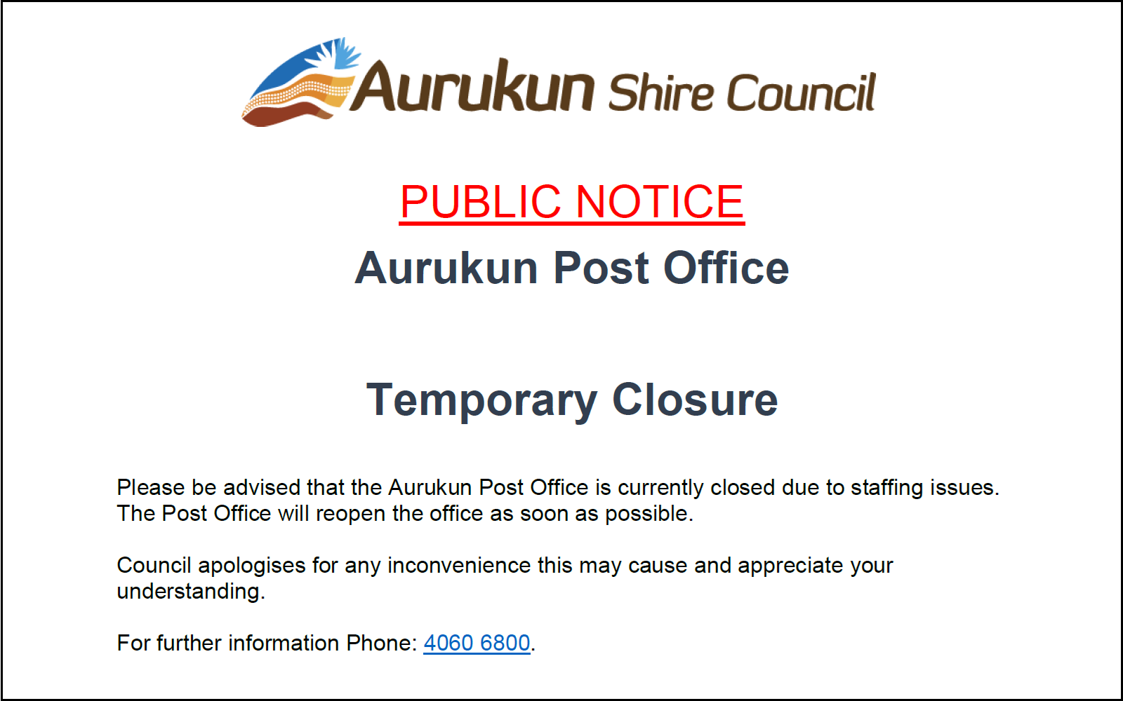 The Aurukun Post Office is temporarily closed due to staffing issues and will reopen as soon as possible.