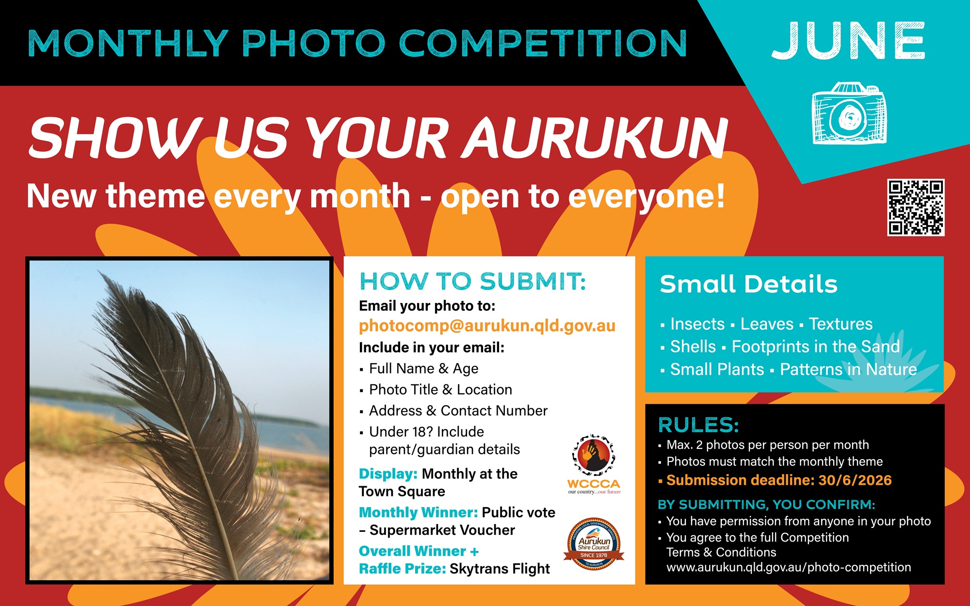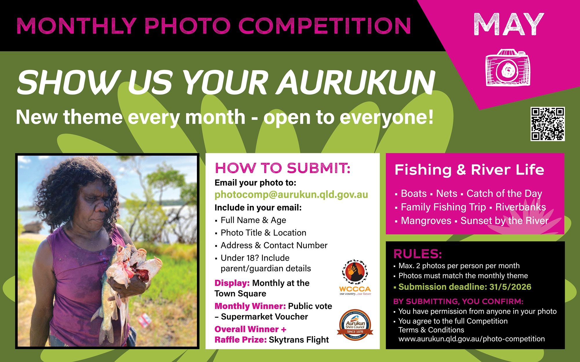 Celebrate Aurukun through your lens! Each month a new theme is announced, and community members are invited to submit photos that capture the spirit, culture, and everyday moments of our town.